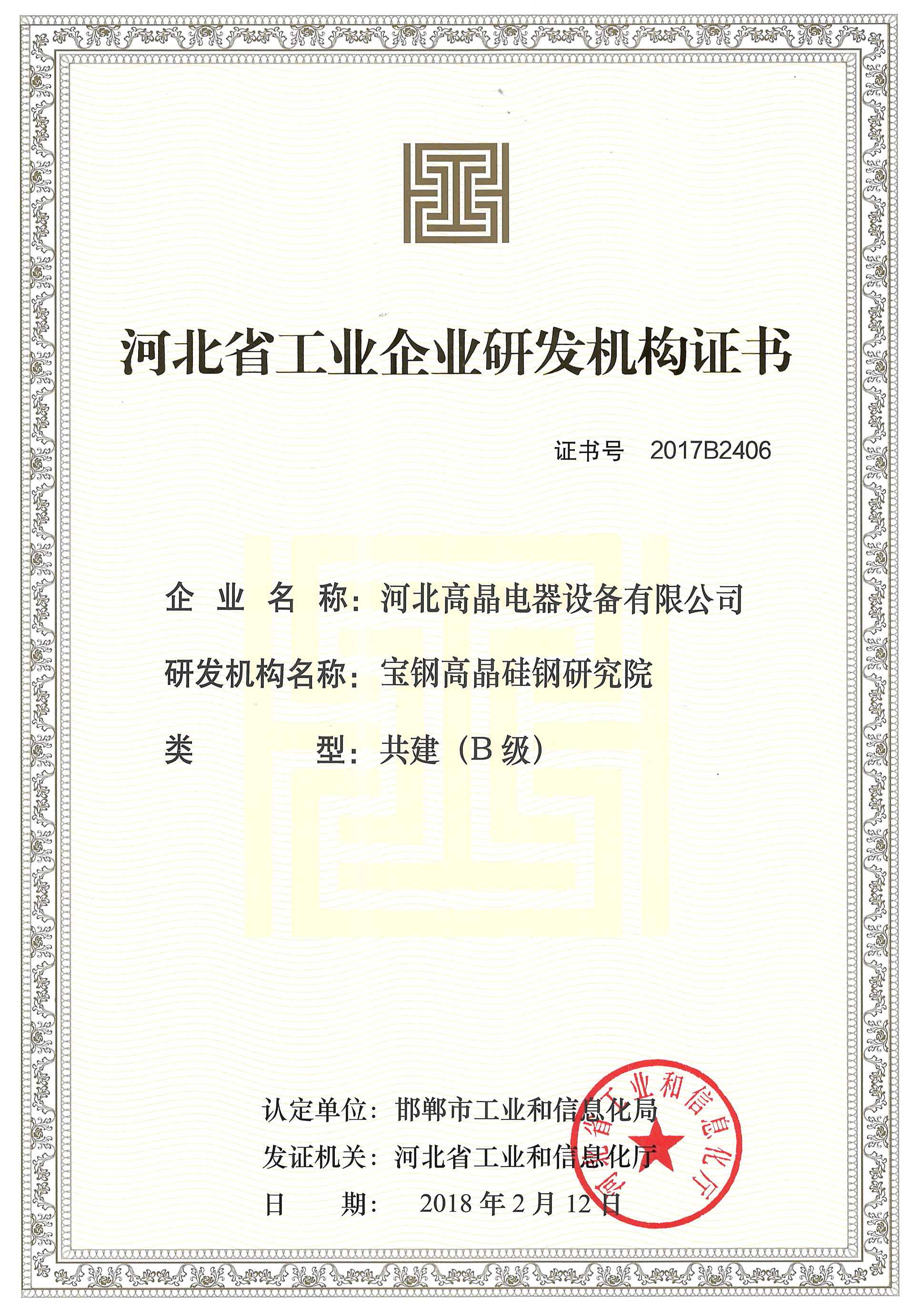 河北省工業(yè)企業(yè)研發(fā)機(jī)構(gòu)證書